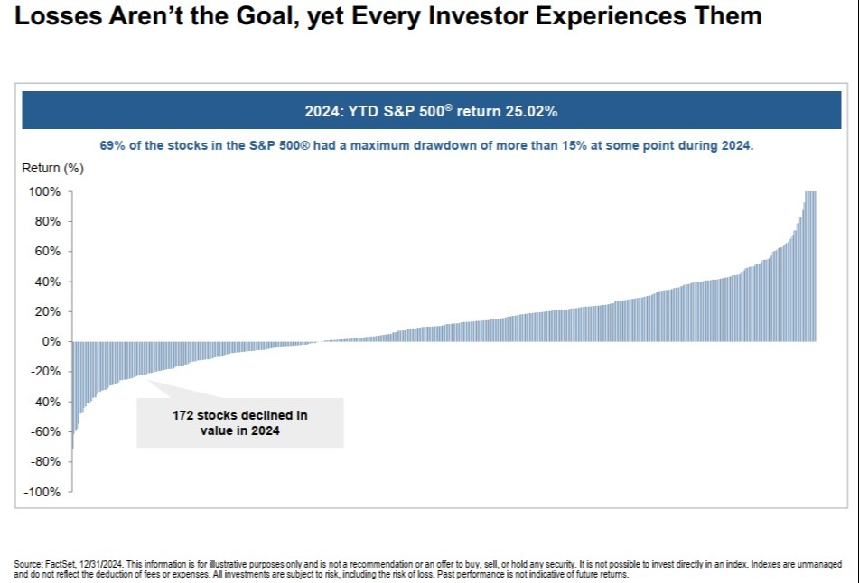 Corporate professionals who are hesitant to sell their employer stock because of the tax bill, can use the losses generated from an active indexing strategy to offset the gain from selling. What is an active indexing strategy? Rather than buy an index mutual fund, investors in an active index strategy buy the actual stocks in the index or a close approximation. Why? The problem with owning an index mutual fund is there is no way to harvest the losses in the underlying index. In any given year, there could be dozens if not hundreds of stocks in the index that trade at a loss, even if the index finishes up for the year. For example, in 2024 there were stocks in the S&P 500 Index which experienced a loss at some point in the year even though the index finished positive (see Figure 1 below). If an investor only owned one S&P 500 index mutual fund, they missed the opportunity to harvest the losses from those underlying stocks. That is a huge, missed opportunity, here's why: